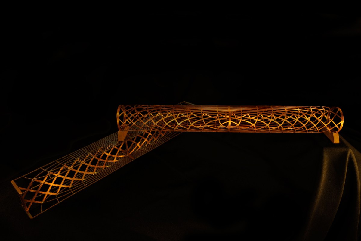 This design was inspired by the “flow net”, a concept hydraulic engineers use to describe groundwater flow fields. The flow net consists of a series of distorted squares. By extending the idea to principle stresses in thin-walled tubes, it is easy to visualize the stress “stream”. If the tube is a bridge over a creek, stresses flow along the lattice network, while the water, people, light and air flow under, through and around the tube.