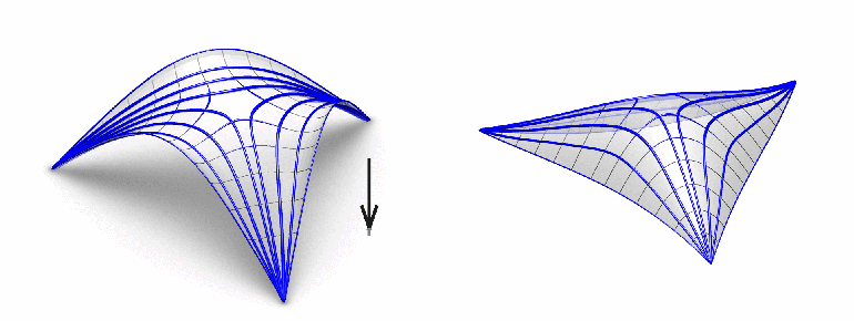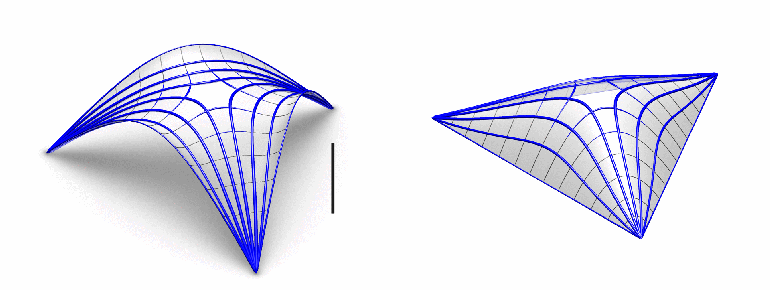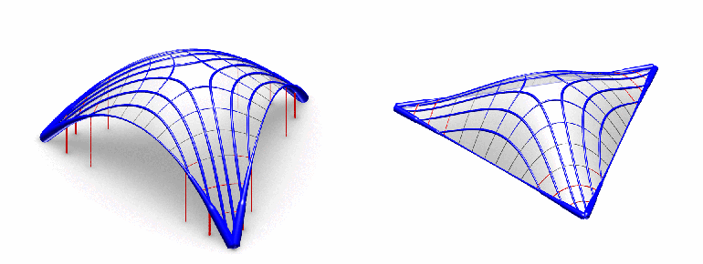 My dissertation introduces a new form-finding method to solve the membrane shells’ equilibrium. The shapes and stress distributions are numerically represented by radial basis functions. The method can start the form-finding process from either a shape or a stress distribution. Then the method imposes free-edge conditions and tweaks the initial input to eliminate the need for vertical supports (fig. 1). The algorithm also has the feature of taking horizontal loads into account. Vertical supports at the edges can help the shells resist horizontal loads (fig. 2). In the absence of vertical supports, the shells need to be thickened to accommodate the eccentricity (fig. 3).