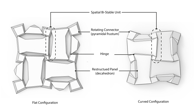 The double-curved surfaces of shells are also quite challenging to produce. I have also invented a type of mechanism that can transform between flat and double-curved states. The mechanisms consist of a set of blocks connected by tiling hinges, which are the key elements introducing the curvature (fig. 4). Multiple prototypes have been produced with different equipment in various materials (videos 1-3)